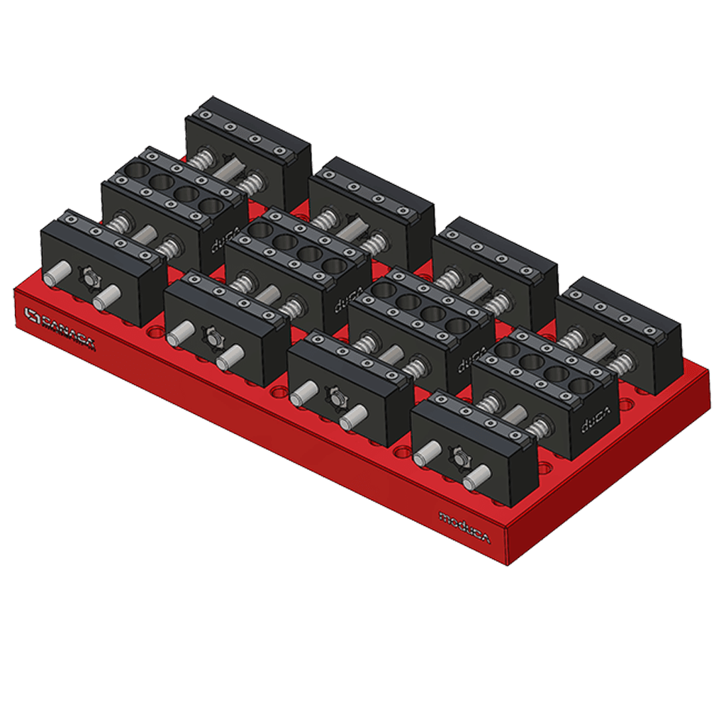 Economical vise with 100 mm jaw width that takes up minimal space. Capability to clamp two parts with 1.5mm height. Directly compatible with moduCA platform.